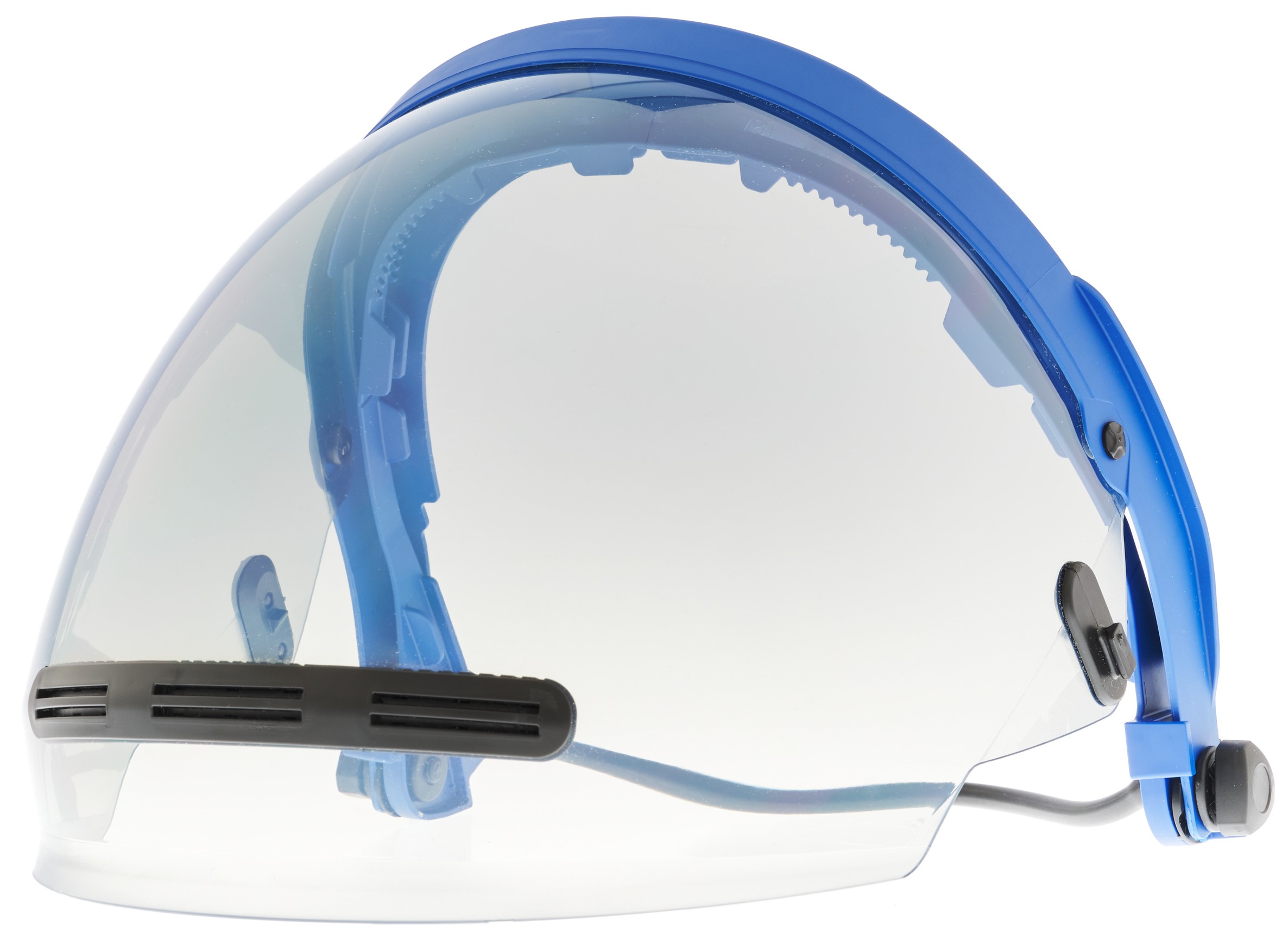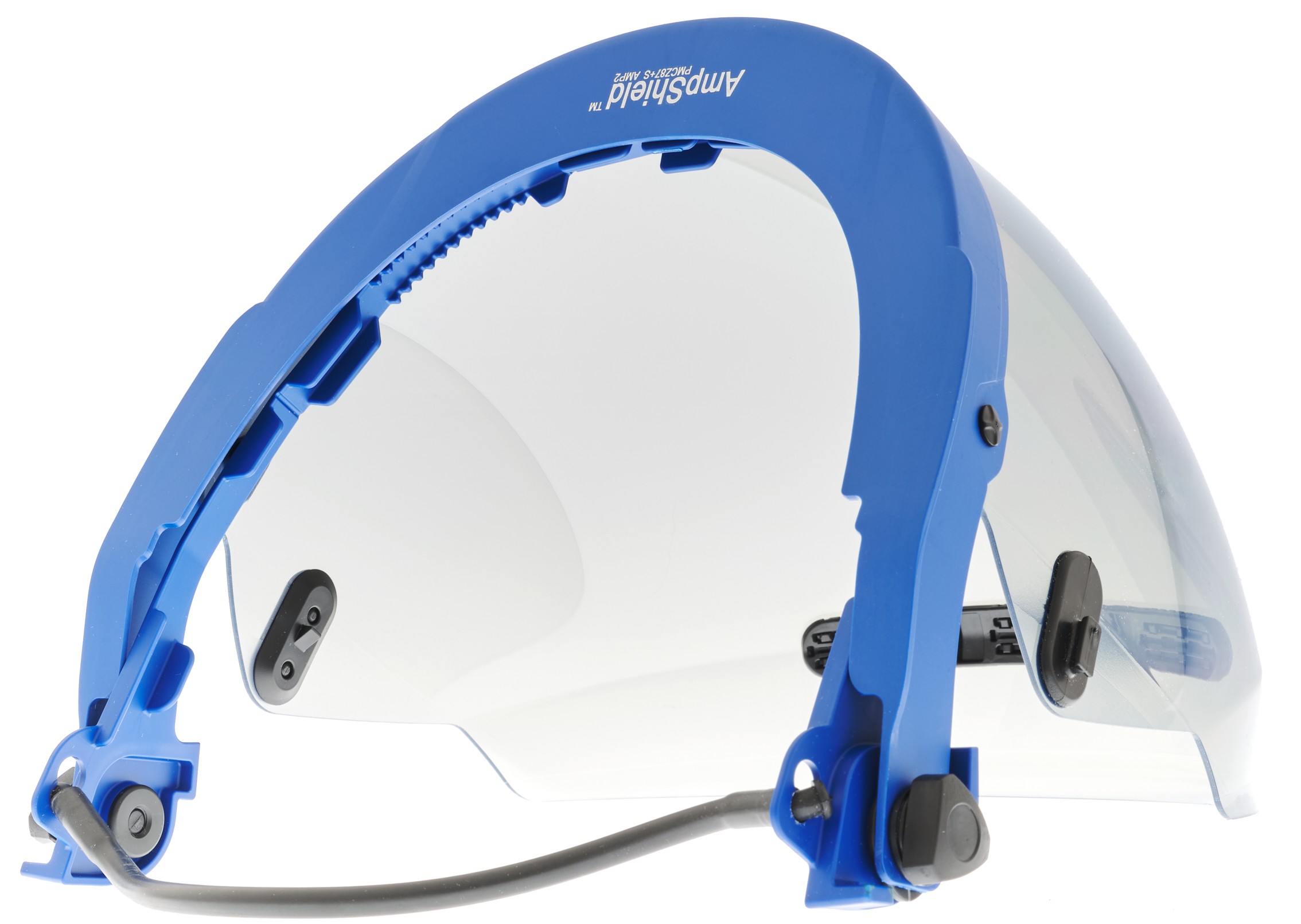 AmpShield® arc flash protection face shield with HT™ nanoparticle lens. ATPV 20 cal/cm². Toric shape allows for wide peripheral view, excellent downward vision, and reduced internal glare. Integrated transparent chin protector gives protection from hazards from below, such as debris and splash. Permanent antifog & anti-abrasion coatings. Patented ArcVent® system enhances ventilation. Weight-compensating universal cap bracket with elastomeric band reduces the weight imbalance felt while above the head in the stowed position. LeverLock® attachment system for easy shield replacement. Press-to-release slotted adapters for easy bracket removal. Compatible with Paulson ALM™ flashlight system (sold separately).