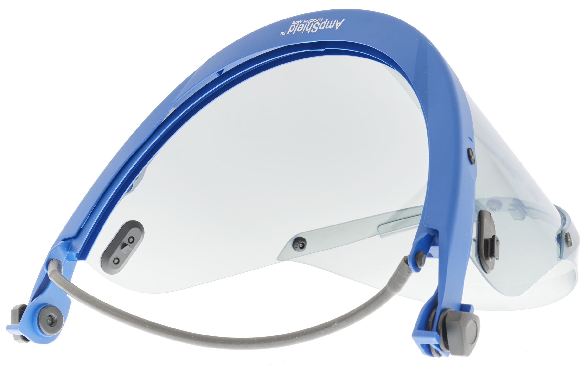 AmpShield® arc flash protection face shield with HT™ nanoparticle lens & transparent ergonomic chin protector. ATPV 20 cal/cm². Permanent antifog & anti-abrasion coatings. Weight-compensating full-brim hat bracket with elastomeric band reduces the weight imbalance felt while above the head in the stowed position. LeverLock® attachment system allows for easy shield replacement. Compatible with Paulson ALM™ flashlight system (sold separately).
