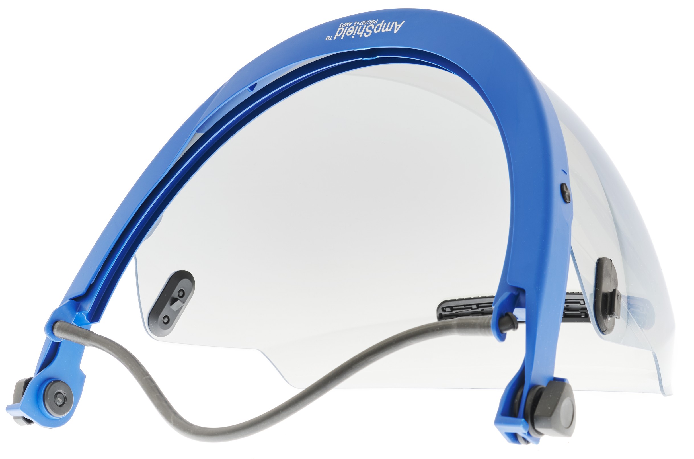 AmpShield® arc flash protection face shield with HT™ nanoparticle lens. ATPV 20 cal/cm². Toric shape allows for wide peripheral view, excellent downward vision, and reduced internal glare. Integrated transparent chin protector gives protection from hazards from below, such as debris and splash. Permanent antifog & anti-abrasion coatings. Patented ArcVent® system enhances ventilation. Weight-compensating full-brim hat bracket with elastomeric band reduces the weight imbalance felt while above the head in the stowed position. LeverLock® attachment system for easy shield replacement. Press-to-release slotted adapters for easy bracket removal. Compatible with Paulson ALM™ flashlight system (sold separately).