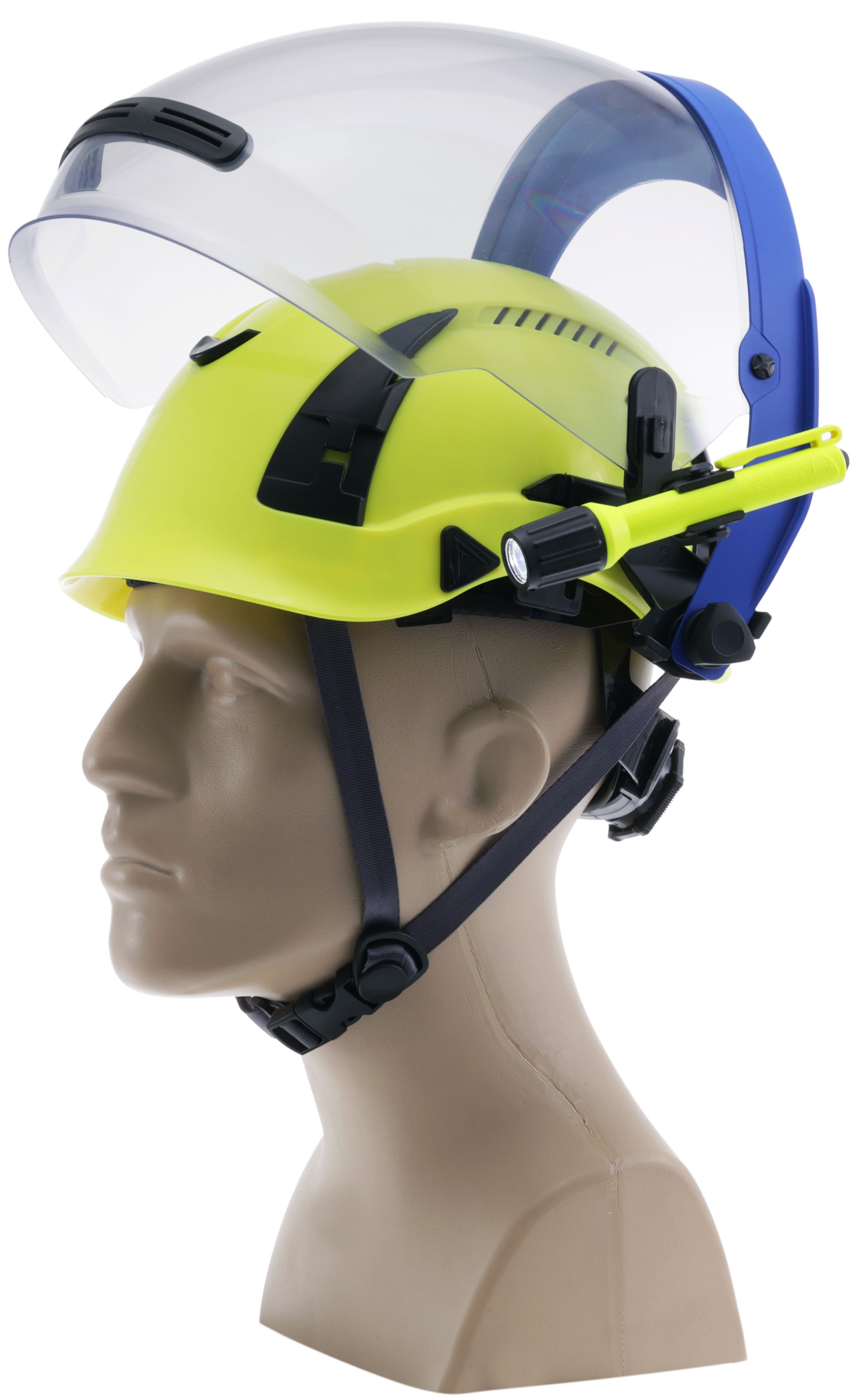 AmpShield® arc flash protection face shield with HT™ nanoparticle lens. ATPV 20 cal/cm². Toric shape allows for wide peripheral view, excellent downward vision, and reduced internal glare. Integrated transparent chin protector gives protection from hazards from below, such as debris and splash. Permanent antifog & anti-abrasion coatings. Patented ArcVent® system enhances ventilation. Weight-compensating bracket with Malta Dynamics Apex® safety helmet compatibility reduces the weight imbalance felt while above the head in the stowed position. LeverLock® attachment system for easy shield replacement. Press-to-release slotted adapters for easy bracket removal. Compatible with Paulson ALM™ flashlight system (sold separately).
