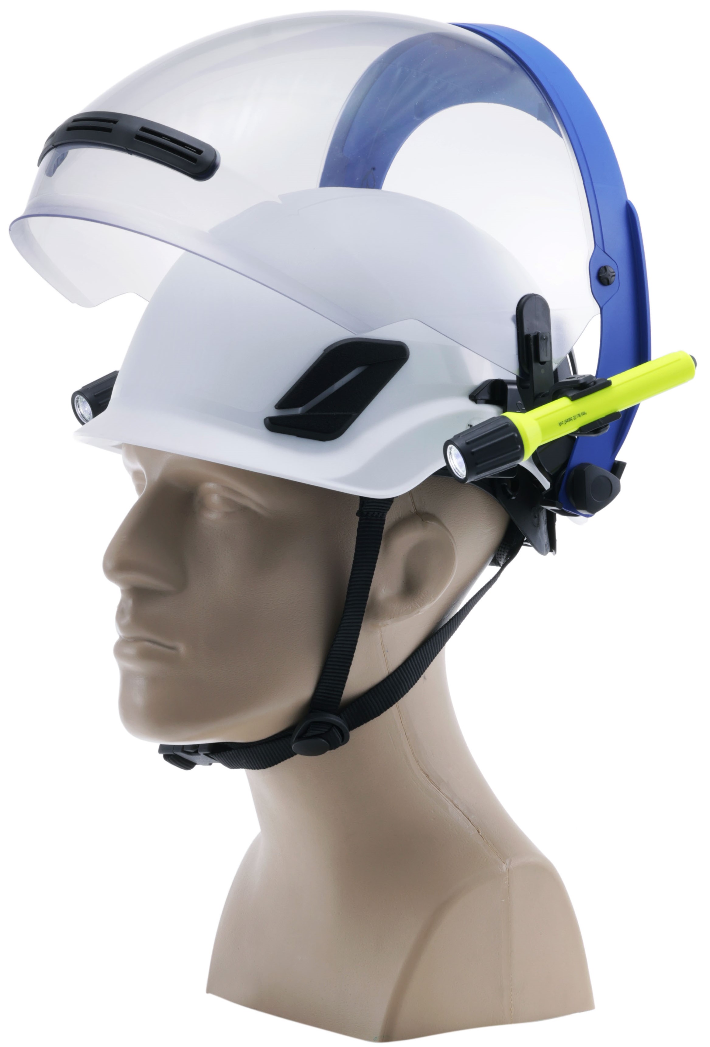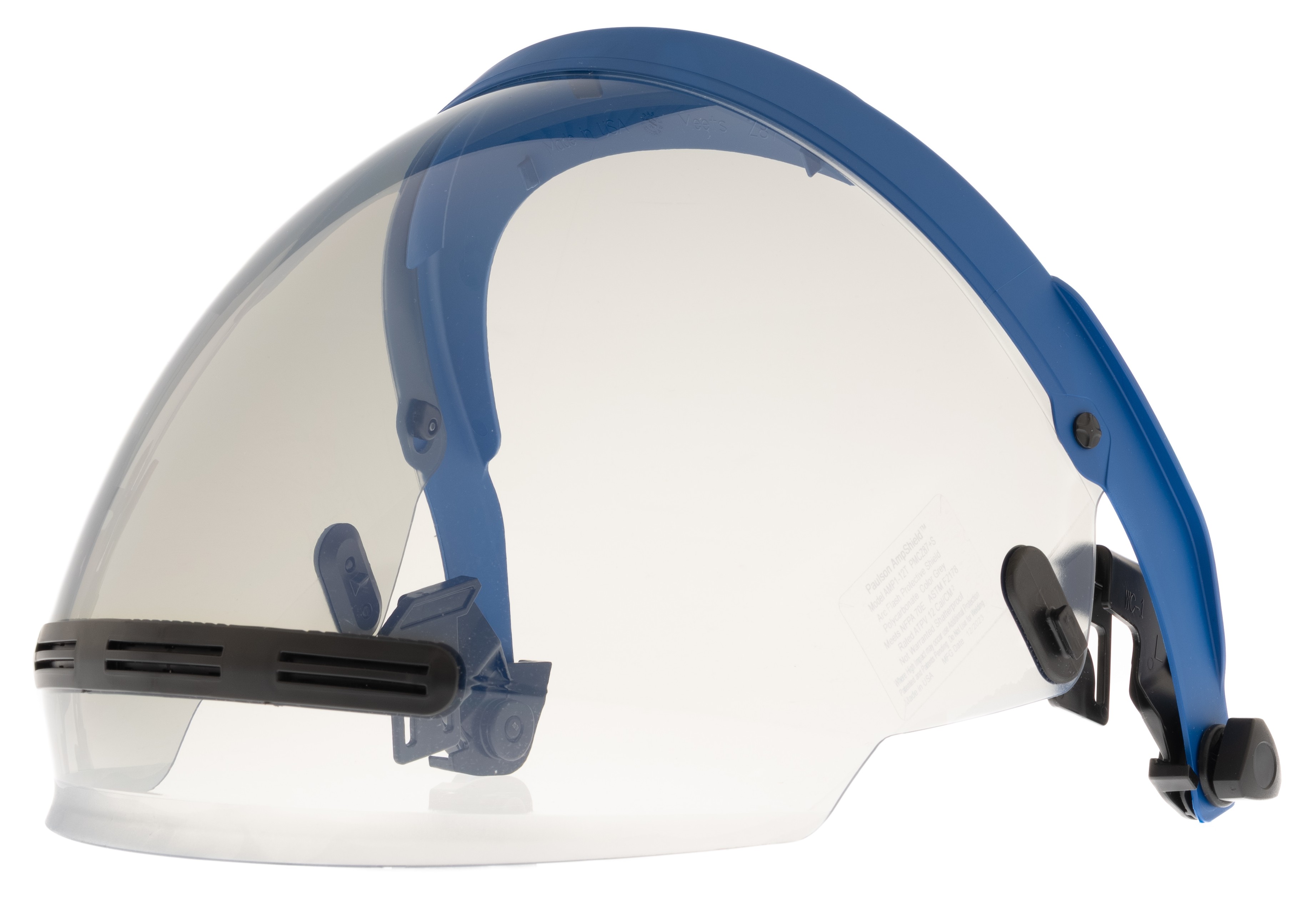 AmpShield® arc flash protection face shield with HT™ nanoparticle lens. ATPV 20 cal/cm². Toric shape allows for wide peripheral view, excellent downward vision, and reduced internal glare. Integrated transparent chin protector gives protection from hazards from below, such as debris and splash. Permanent antifog & anti-abrasion coatings. Patented ArcVent® system enhances ventilation. Weight-compensating bracket with Bullard® safety helmet compatibility reduces the weight imbalance felt while above the head in the stowed position. LeverLock® attachment system for easy shield replacement. Press-to-release slotted adapters for easy bracket removal. Compatible with Paulson ALM™ flashlight system (sold separately).