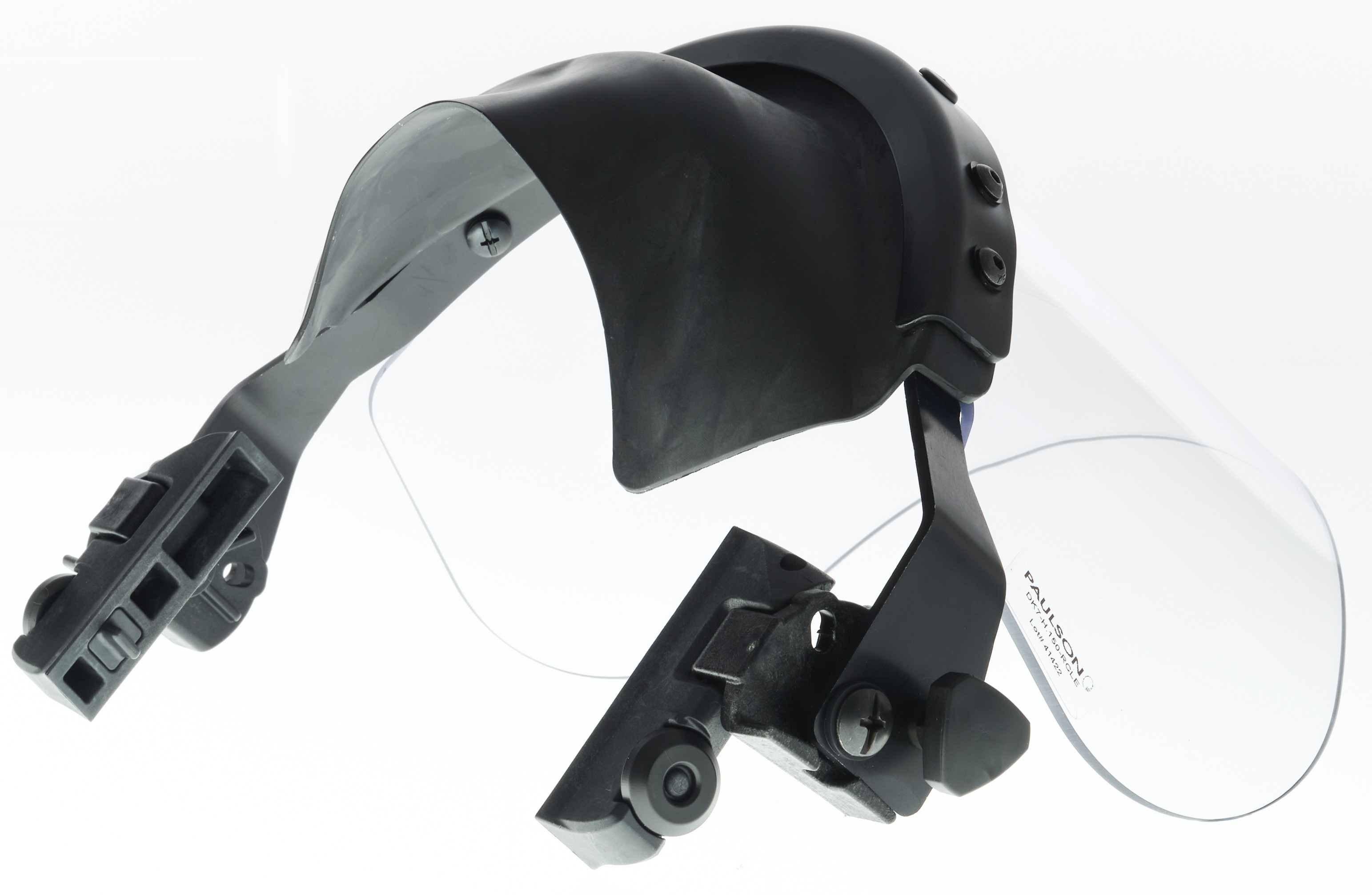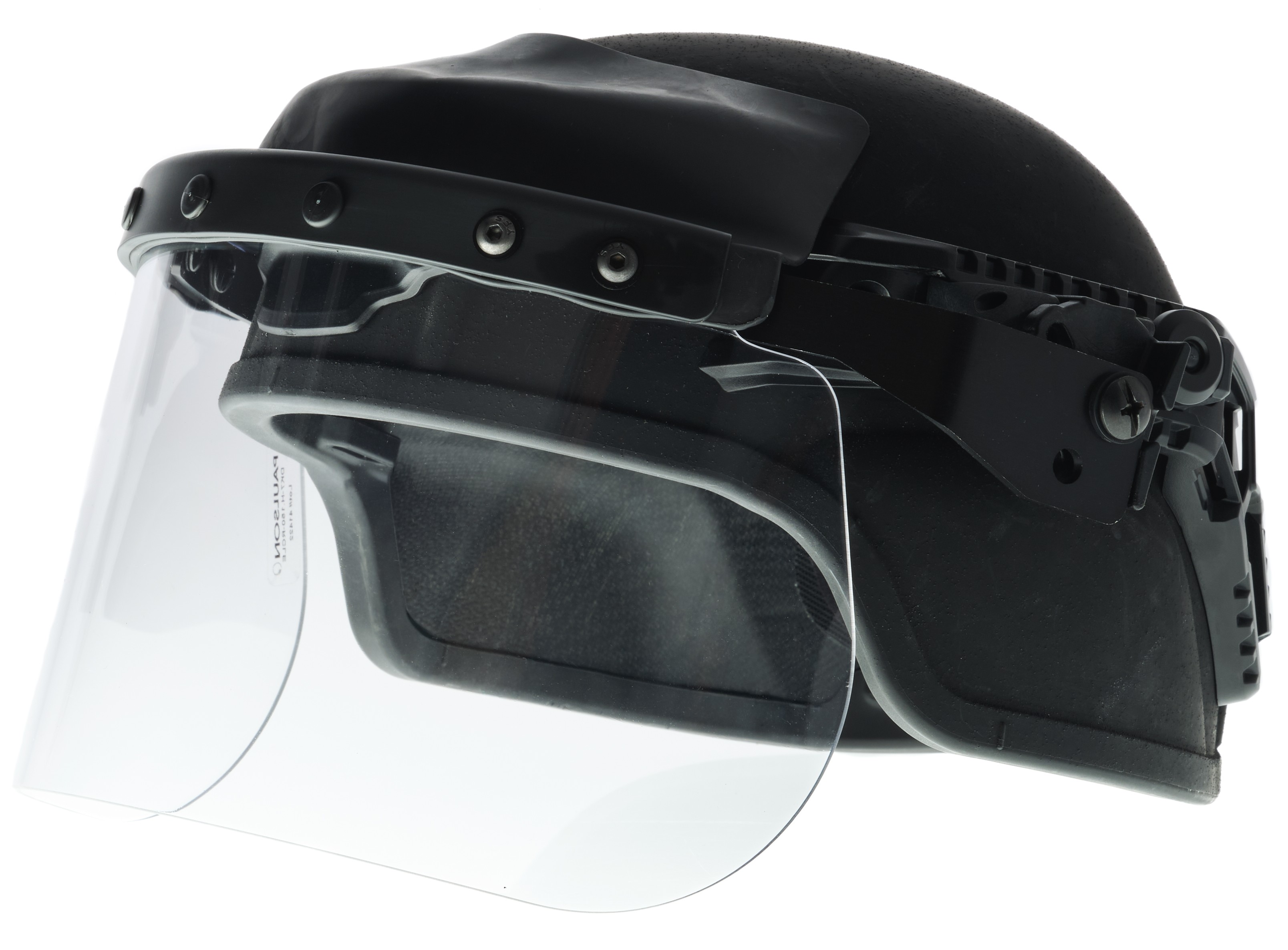 Rail-mount tactical face shield system designed to fit Ops-Core® or similar side rail systems. Aluminum arms that extend the shield outward assist in cheeking a long gun and allows for excellent ventilation. Premium shield coatings feature an anti-abrasion hard coating on the exterior & permanent anti-fog on the interior. Optically correct lens. V-50 rating for fragmentation. Extended integral rubber seal at shield-helmet interface prevents liquid pass-through. Shield length of 6" allows for gas mask clearance.