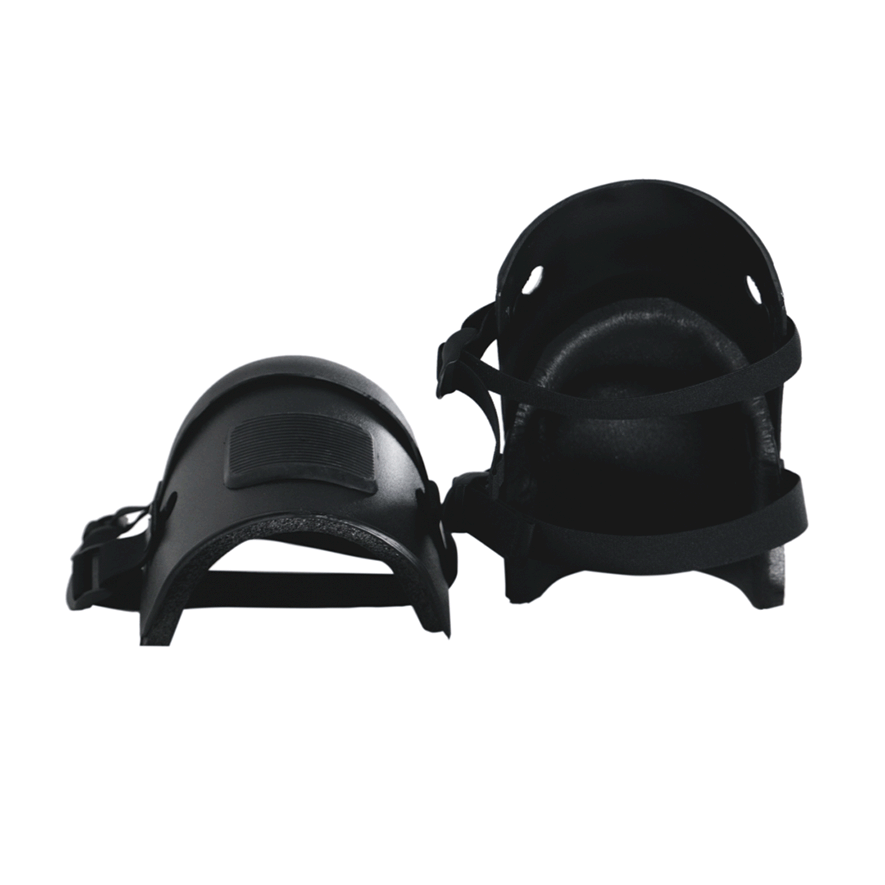 Protective knee shield with articulated rigid shell and foam pad. Heavy elastic adjustment feature. Designed for cell extraction or riot control. Sold as a pair.