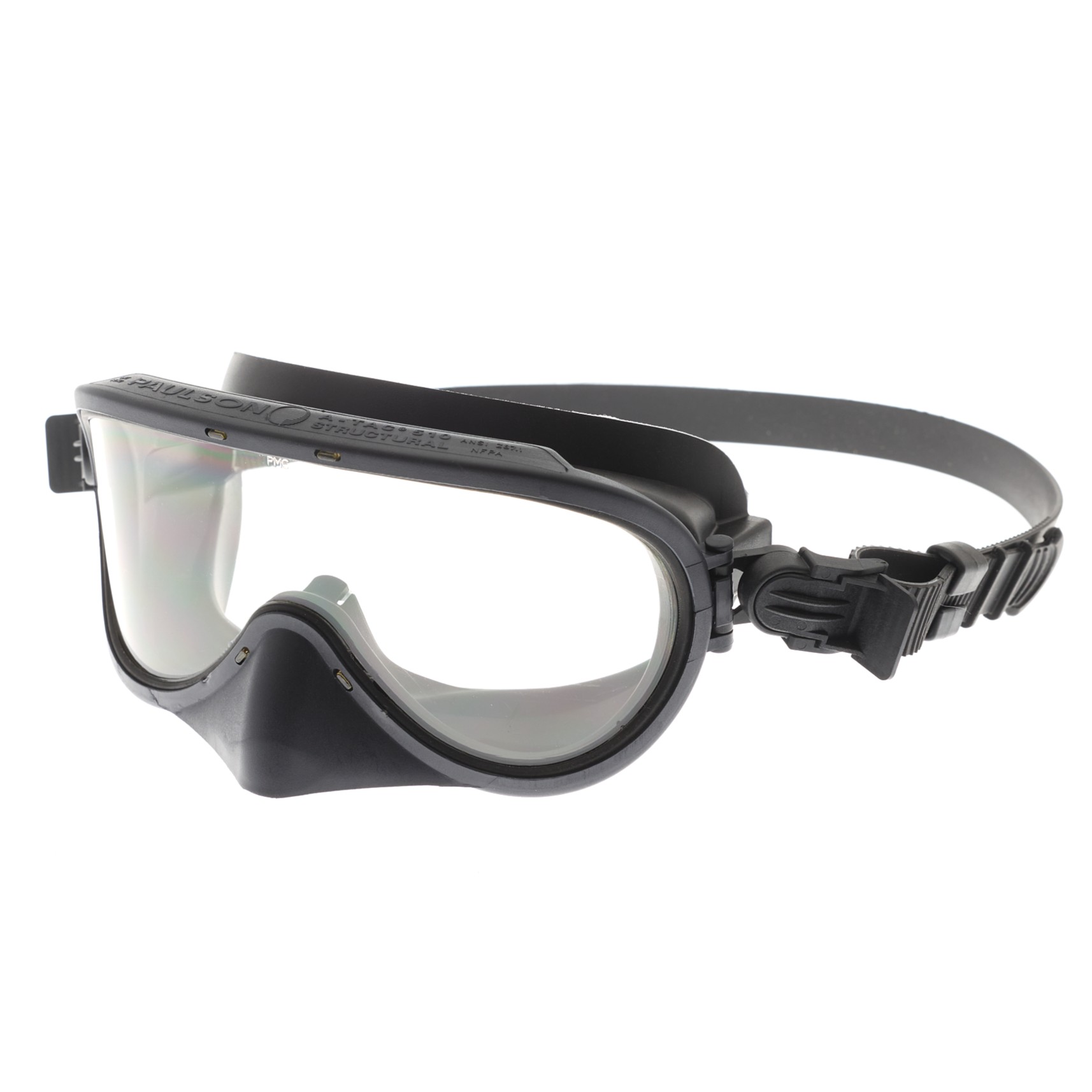 A-TAC® structural firefighter protective goggle with nose shield. Baffled top and bottom vents. Silicone strap designed for comfort when worn on the head. May be stowed on the helmet. Optically corrected lens. 100% UV lens. Includes mounting clips to attach to fire helmets. Fits over most prescription glasses. Premium lens coatings feature an anti-abrasion hard coating on the exterior and permanent anti-fog on the interior.